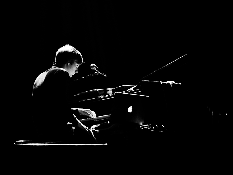 Arnalds’ stage persona appeared in the occasion of the concert very modest and inconspicuous. Aided by the obscurity that enveloped the whole scene, with just very essential illumination to keep him and his four-piece string orchestra visible – though they too were at topical times swallowed by darkness – he let the audience have glimpses of him now and then, subtly and quietly. The piano’s and the strings’ voices occupied the whole space, sometimes with the interjection of sampled sounds – percussions mainly, but also more instrumentation and even human muttering. The music flow was rarely interrupted to give Arnalds the chance to interact with the audience in his native tongue.
