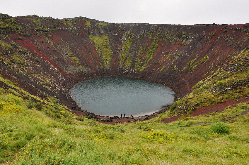 Treditionally, the Golden Circle’s first stop is the crater of Kerið, then a volcano and now a small lake. The crater is located in Grímsnes, also known as Iceland’s Western volcanic area. It is believed Kerið was originally a cone volcano which collapsed after exhausting its magma reserve. At approximately 3,000 years of age, Kerið is relatively young if compared to other volcanic formations present in the same area. The pool of water filling the bottom of crater, of a stunning turquoise color, contains high levels of minerals which are abundant in the soil.