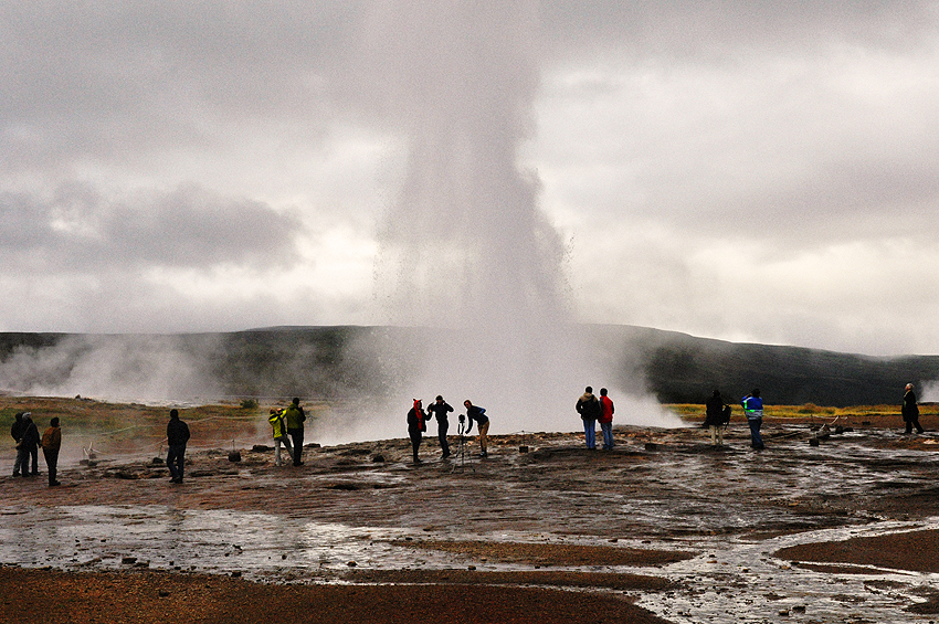 After Faxi, we moved on to the next stop. Geysir and Strokkur are located in the Haukadalur valley, with just a few meters separating them. Geysir, the original geyser to which every other geyser in the world owes its name (the word geysir comes from the Old Norse word for gusher), sadly is not as active as it was in the distant past. For many years in a row the geyser remained entirely dormant. Earthquakes and human influence decreased its activity over the years and at the moment Geysir’s powerful eruptions of hot water cannot be appreciated more than three times a day. Strokkur, the other famous geyser in the area, in spite of its smaller size, is much more lively, erupting every five minutes or so. Visitors tend for this reason to gather around the reliable Strokkur to enjoy its frequent outbursts, while Geysir, once capable of impressive gushes reaching heights of more than 70 meters, lays most of the time forgotten in the background.