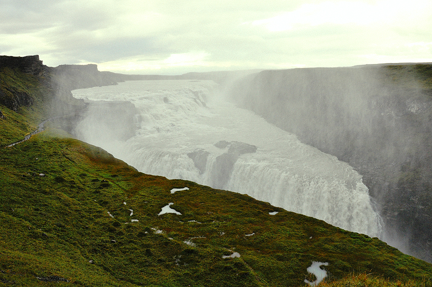 I already expressed my fear of waterfalls. Gullfoss looked terribly frightening to me. With its waters suddenly swallowed by the apparently bottomless crevice, it seemed like one of those intimidating views you see in XIX century paintings, with man as a negligible element at the mercy of natural forces. Kátur, usually so eager to explore, also felt unusually prudent in proximity of the rocks forming the waterfall’s precipice.