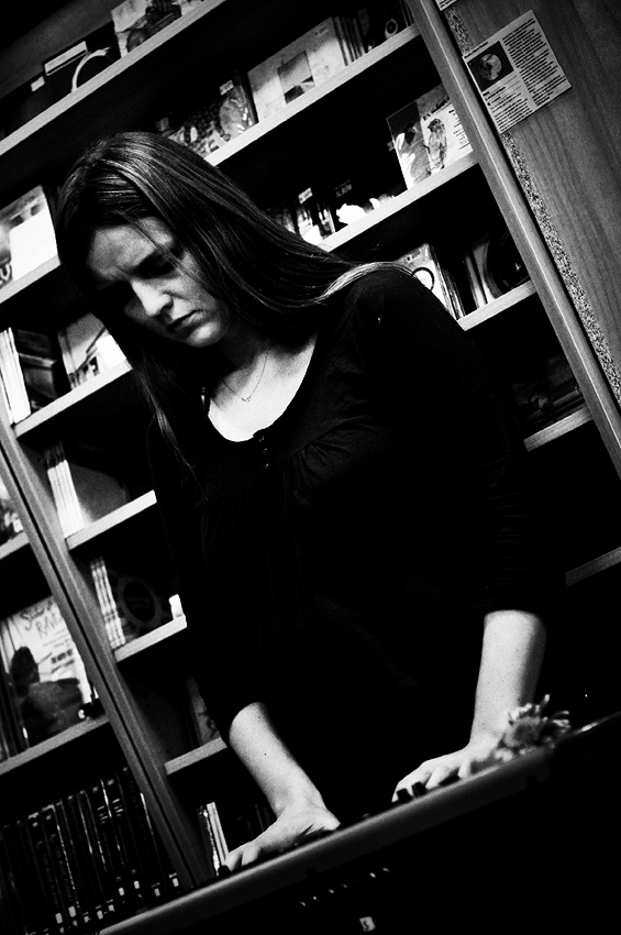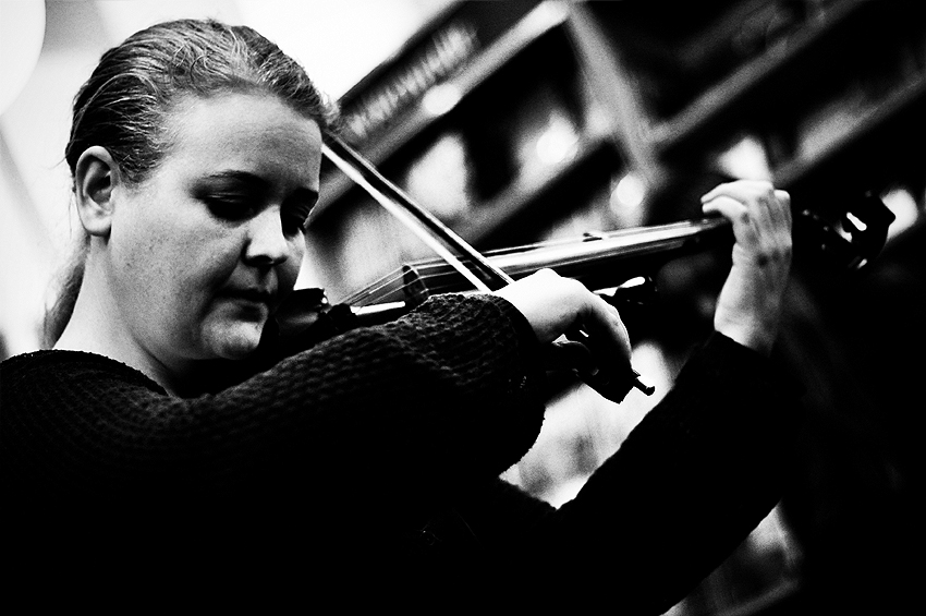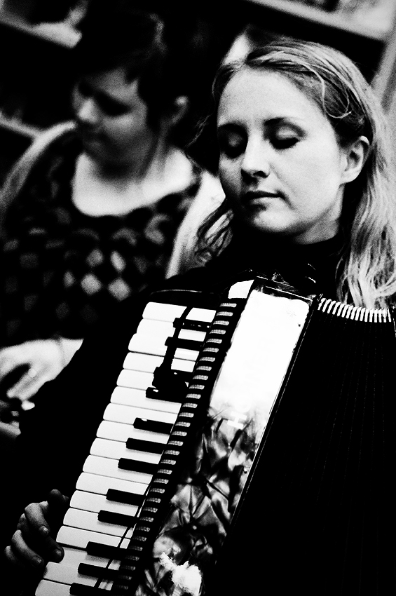 Amiina played yesterday at Eymundsson bookstore for admirers, friends and casual bystanders. I got to the bookstore just in time for the show to start, after a walk in the wind that almost defeated me. Eymundsson by that time was crowded enough to force me to find a spot next to the trash bin, near the refreshments stand. If I can give you people a suggestion: never stand by a refreshments stand, especially if what they offer is free. Even if at first doesn’t look like it, it’s going to be a popular spot, trust me. The whole time I had to be careful to not inadvertently kick or elbow children that were continuously wanting a cookie or a juice refill. Nightmare.